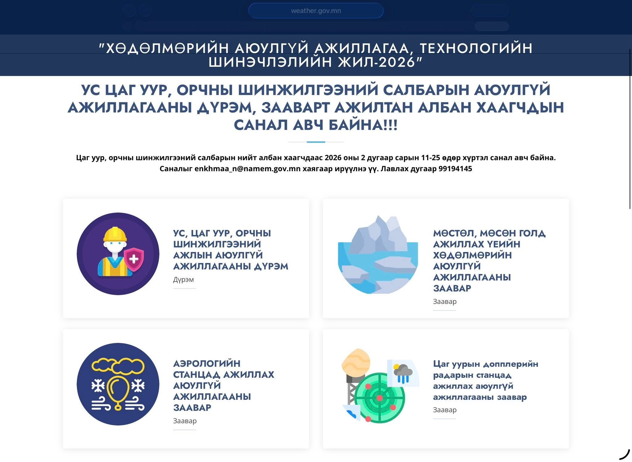 Ус цаг уур, орчны шинжилгээний салбарын хувьд 2026 он "Хөдөлмөрийн аюулгүй ажиллагаа, технологийн шинэчлэлийн жил". Салбарын аюулгүй ажиллагааны дүрэм, журам, зааварт бүх албан хаагчид, мэргэжлийн хүмүүсийн саналыг нээлттэй хүлээн авч, шинэчлэх ажил эхэллээ.